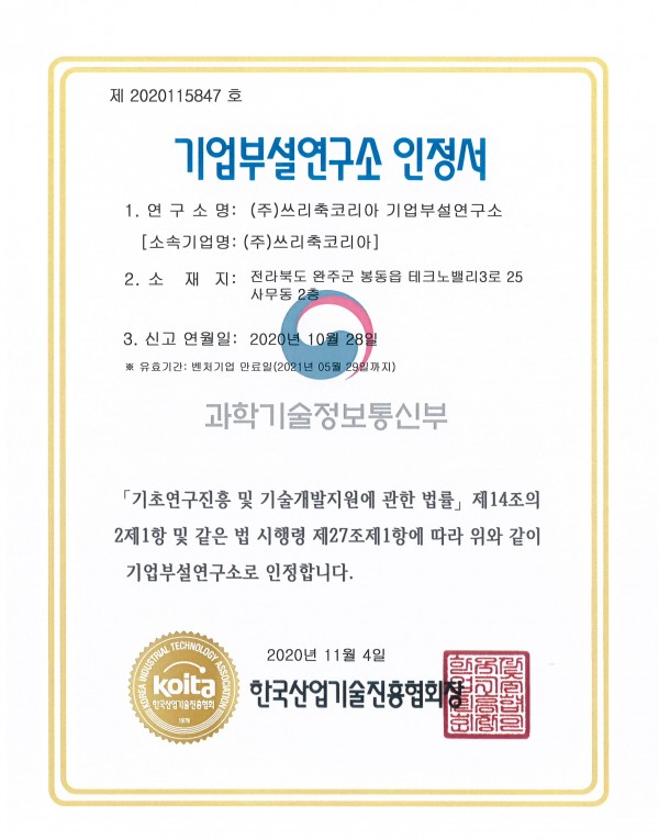 기업부설연구소 인정서입니다.
