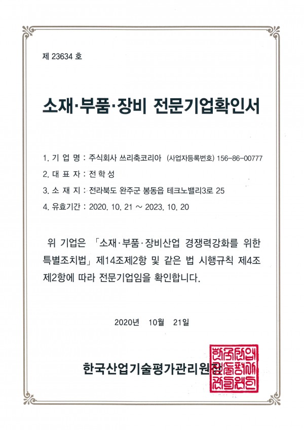 소재・부품・장비 전문기업 확인서 입니다.